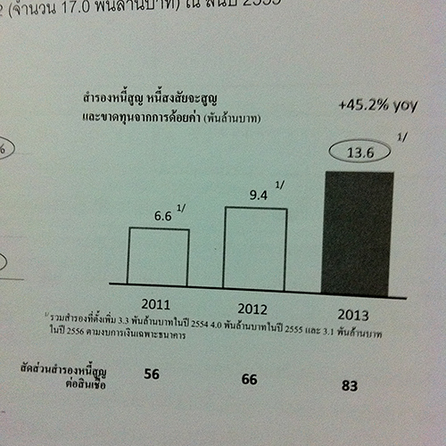 หรืออีกข้อมูลเช่นหนี้สงสัยจะสูญ หรือหนี้เสียต่างๆ เช่นทำไมธนาคารไทยพาณิชย์มีการสำรองเพิ่มขึ้นกว่า 3.3 พันล้านบาท หรือกว่า 45% จากปีก่อน นั่นกำลังแสดงนัยทางปัญหาการเงิน หรือปัญหาเศรษฐกิจอะไรในประเทศไทยเราหรือไม่? ตรงนี้เองเราก็ควรทำการบ้านเพิ่มเติมเพื่อสอบถามปัญหาและรับฟังแนวโน้มทางเศรษฐกิจจากผู้บริหารผู้เชี่ยวชาญทางการเงินเป็นอย่างดี
