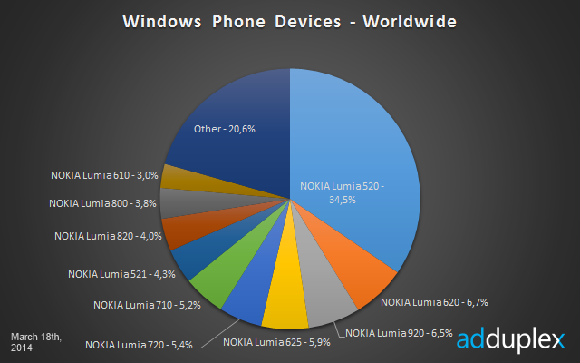 ยังคงครองแชมป์เป็นรุ่นยอดนิยมของ Windows Phone อยู่ Nokia Lumia 520 มีผู้ใช้งานอยู่ 34.5% และมีผู้ใช้งานเพิ่มขึ้นจากเดือนที่แล้วอีกด้วย รองลงมาเป็น Nokia Lumia 620 และ Nokia Lumia 920 ส่ิงที่น่าสนใจก็คือรุ่น Flagship อย่าง Nokia Lumia 1020, Nokia Lumia 1520 กลับไม่ได้รับความนิยมแต่อย่างใด อาจจะติดในเรื่องของราคาที่สูงก็เป็นได้