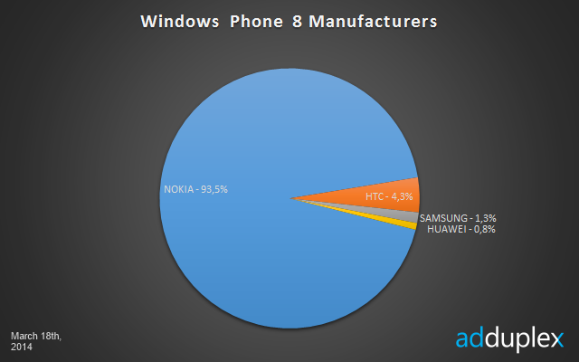 เจ้าตลาด Windows Phone คงหนีไม่พ้น Nokia ที่ครองตลาดอยู่ 93.5% ซึ่งเติบโตขึ้นจาก 92.6% เมื่อเดือนที่แล้ว