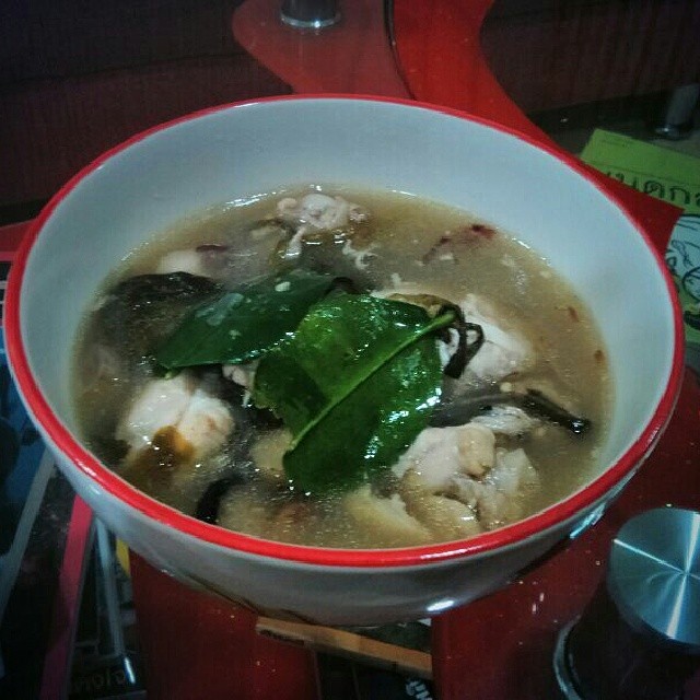 จากนั้นเอาไก่ลง ใส่เห็ด คอยช้อนฟองออกลงผักตามยกเว้นใบมะกรูด ลงทีหลังสุดครับ พอเนื้อไก่โอเคแล้ว ยกขึ้นครับ
