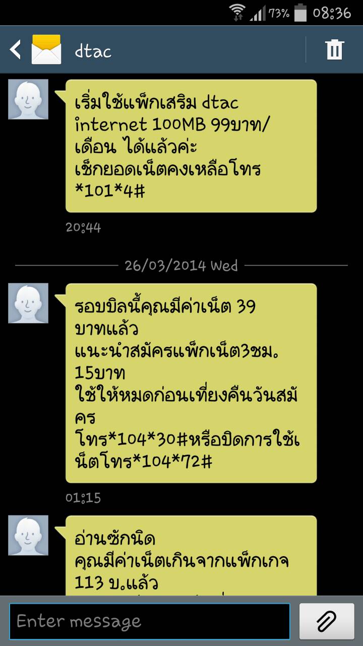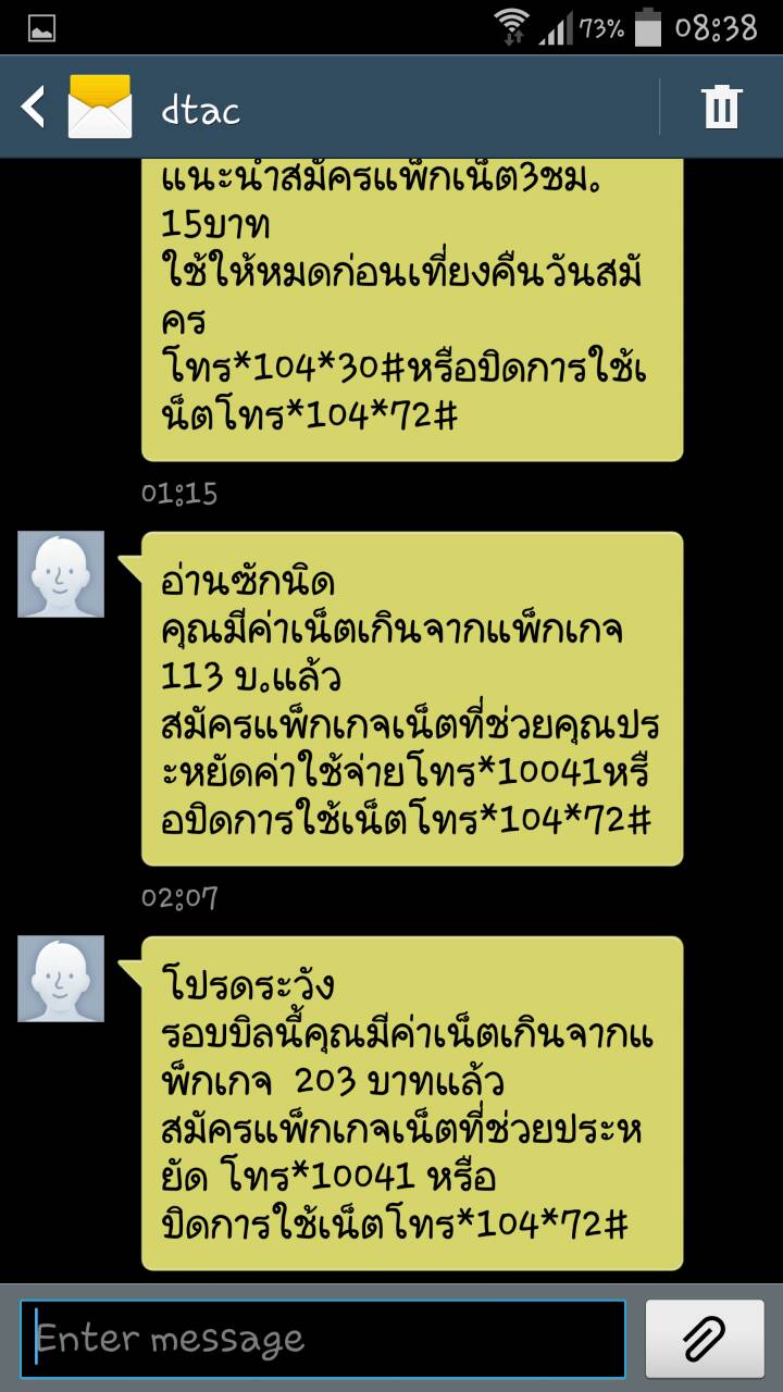 และเมื่อเวลาประมาณ 1:15 (ตีหนึ่ง) ก็ได้ SMS จาก Dtac อีกครั้งว่าแนะนำให้สมัครแพ็กเสริม Internet