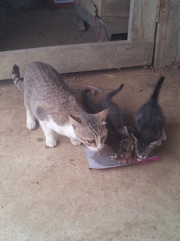 ไปทำธุระที่บ้าน จ.นครปฐม เจอแมวมาคลอดลูกไว้ที่ห้องเก็บของบริเวณบ้านแต่เนื่องจากแถวนั้นเป็นป่าไร่ ยากแก่การหาอาหาร ตอนเจอสภาพหิวโซมาก โชคดีที่มีอาหารแมวติดตัวไปตลอด กินวิสกัสหมดเกลี้ยงไป 3 ซอง แต่ด้วยที่อยู่ กทม เป็นแค่ห้องเล็กๆและอุปการะแมวโตมา 2 ตัว จึงไม่สามารถรับ แม่แมว1 ลูก4 ได้อีกได้แต่ทิ้งอาหาีเม็ดไว้ให้จำนวนนึงและจากมาด้วยความไม่สบายใจค่ะ จึงอยากขอความกรุณาทุกท่านเมตตาเด็กๆด้วยนะคะ