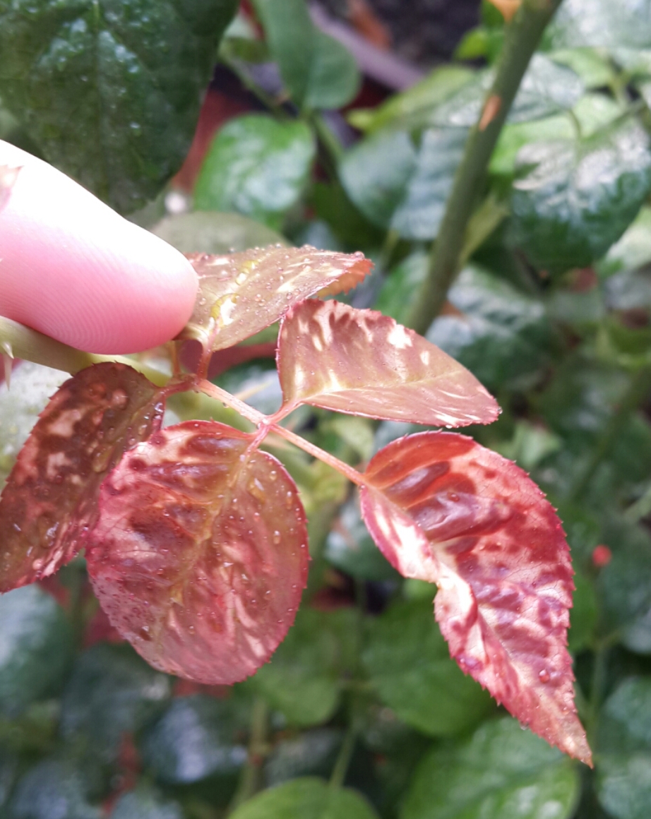 ยอดอ่อนของ Strawberry Hill ออกมา และมีลักษณะลายดังรูปค่ะ ไม่ทราบว่าเป็นอะไร เป็นอยู่ 3 ยอด จาก 6 ยอดค่ะ