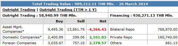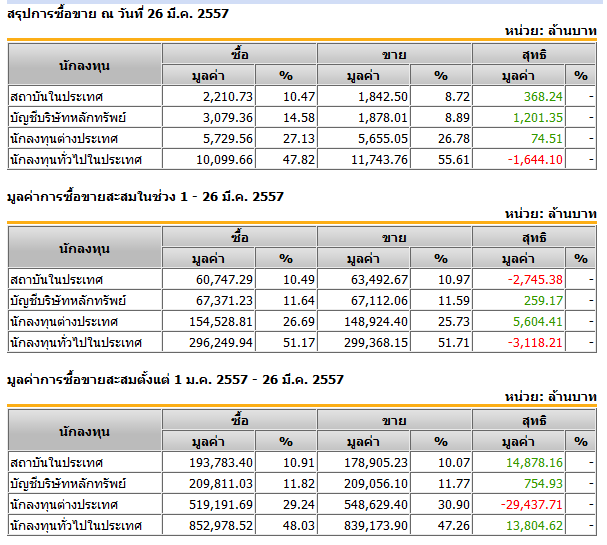 เว็บไซต์ตลาดหลักทรัพย์แห่งประเทศไทย รายงานสรุปการซื้อขายหลักทรัพย์ โดยแบ่ง ตามประเภทนักลงทุน ประจำวันที่ 31 มีนาคม 2557 ดังนี้ กลุ่ม ปริมาณซื้อ % ปริมาณขาย % สุทธิ (ลบ.) (ลบ.) (ลบ.) นักลงทุนสถาบัน 2,