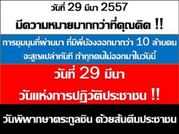 26 มี.ค.57 ผู้สื่อข่าวรายงานว่า หลังจากที่ นายสุเทพ เทือกสุบรรณ เลขาธิการ กปปส.ประกาศนัดเป่านกหวีดแสดงพลังครั้งใหญ่ ในวันที่ 29 มี.ค.นี้ ส่งผลให้ในโลกสังคมออนไลน์ ได้มีการทำสติ๊กเกอร์รวมพลัง 29 มี.ค.ขึ้นมากันอย่างแพร่หลาย และมีการแชร์ต่อๆ กันในหลากหลายรูปแบบ