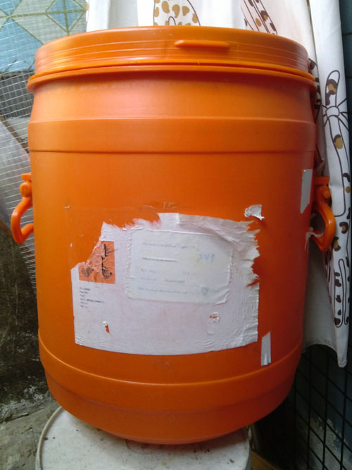 พอดีมีเพื่อนบ้านให้ถังมาใบนึงค่ะ ว่าจะไว้ใส่ข้าวสารค่ะ แต่ว่าสีฉูดฉาดเหลือเกิน แถมแอบมีเห็นเครื่องหมายกากบาทบนกระดาษที่ถูกลอกออกไปแล้วด้วย