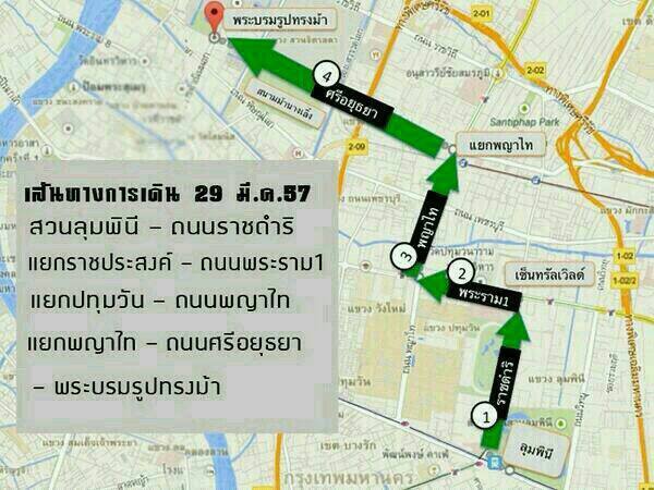 เส้นทางเคลื่อนขบวนของกลุ่ม กปปส. ใน 29 มี.ค.57 เริ่มจากสวนลุมพินี ผ่านหน้าพระบรมราชานุสาวรีย์ฯ และ แบ่งขบวนเป็น 6 ขบวน ได้แก่