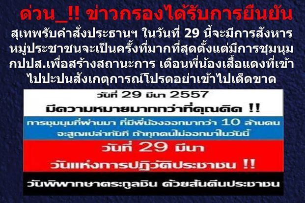 เพิ่งได้รับมาเมื่อกี้เอง จริงไม่จริง ไม่รู้ แต่ พยายามหลีกเลี่ยงดีที่สุด ทุกชีวิตมีค่า มากกว่าจะเอา ชีวิตไปสังเวยกับ ม๊อบสุเทพ เทือกสุบรรณ