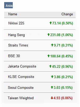 ดัชนีในตลาดเอเซีย ทั้งหมดขึ้นไปออกเขียว มีแกะแดงอยู่ ๑ แห่ง