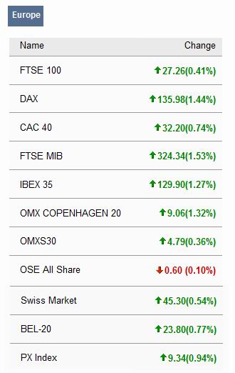 ดัชนีในตลาดยุโรป ทั้งหมดก็ขึ้นไปออกเขียวขจี มีแกะแดง ๑ แห่งเช่นกัน