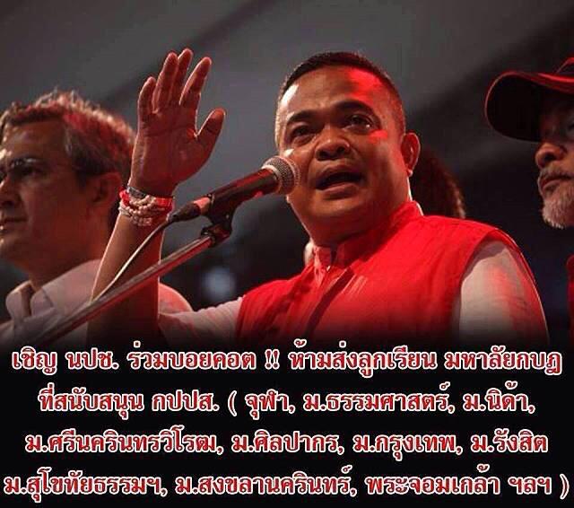 พี่ตู่ขอเชิญชวนชาวเสื้อแดง มีลูก มีหลาน ร่วมบอยคอต ไม่ส่งลูกหลานเรียนมหาวิทยาลัยกบฏเหล่านี้ ชาวเสื้อแดงผู้รักประชาธิปไตยในนี้ จะร่วมกันบอยคอตไหมครับ