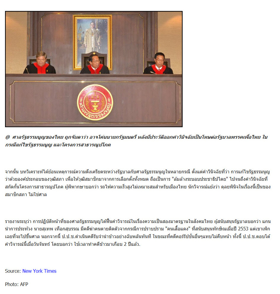 นิวยอร์กไทม์จับตาพลังปฏิปักษ์ประชาธิปไตยในศาลและองค์กรอิสระ จ่อวินิจฉัยคดีรับจำนำข้าวเข้าทางกลุ่มต่อต้านรัฐบาลพรรคเพื่อไทย พร้อมชำแหละเครือข่ายสืบทอดอำนาจจากรัฐ