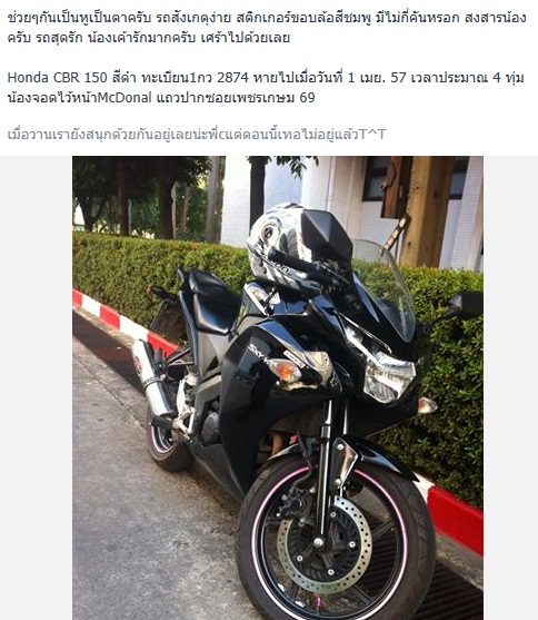 รบกวนพี่ๆ ชาวพันทิป เป็นหูเป็นตาให้อีกแรงนะครับ รถจักรยานยนต์ Honda CBR 150 สีแดง-ดำ ทะเบียน องพ 451 กรุงเทพมหานคร หายตอนตี 3 วันที่ 2/6/56 จอดไว้ใต้ทางด่วนดินแดง ซอยตลาดศรีวนิช ซอยตรงข้าม ปปส. ตอน