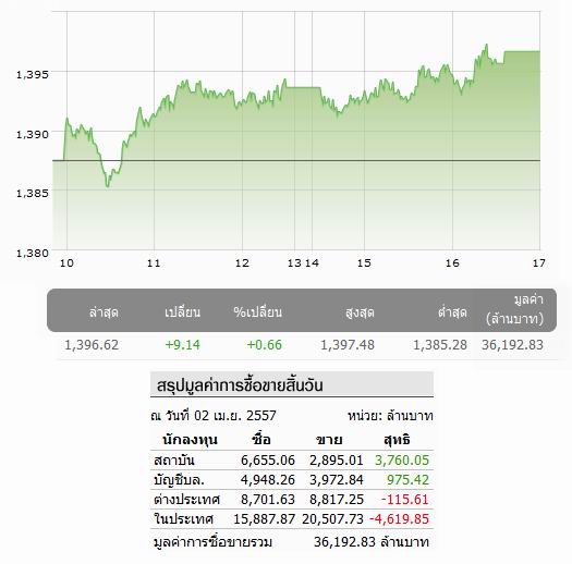 แล้วอ่อนตัวลงเล็กน้อย ไปปิดที่เนิน 1,396.62 +9.14 จุด
