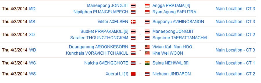 โปรแกรมการแข่งขันของนักกีฬาไทย 3 เม.ย. 2014 รอบ 16 คน