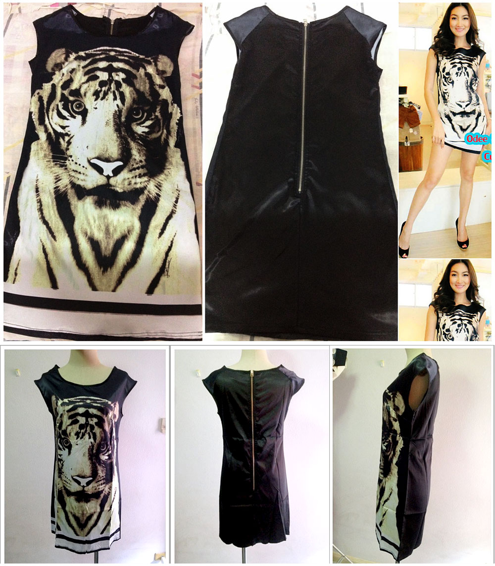 new เดรสหน้าเสือ ทรงเข้ารูปหลวมๆ ผ้าทิ้งตัวไม่บาง ไหล่หนุนฟองน้ำ อกได้ถึง 36 เอว 30 สะโพกฟรี ด้านหน้ายาว 29/หลังยาว 34 นิ้ว
