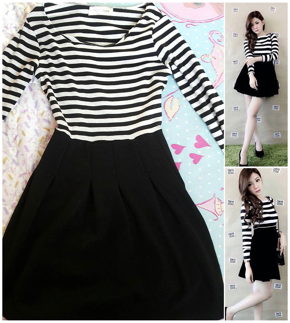 use 1 time เดรสแขนยาวลายขวางขาว-ดำ ตัดต่อกระโปรงทวิสสีดำ สภาพใหม่ อก 32-34 เอว 26-28 สะโพกฟรี ยาว 30 นิ้ว
