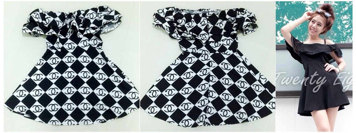 เดรสเปิดไหล่ ลายชาแนล มีระบายรอบตัว ผ้ายืดเด้งๆ ทรงสวยมากค่ะ อก 32-34 เอว 26-28 สะโพกฟรี ยาวประมาณ 28 นิ้ว