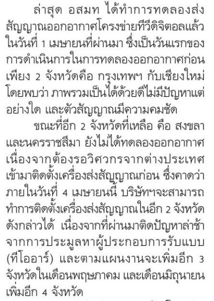 ล่าสุด อสมท ได้ทำการทดลองส่งสัญญาณออกอากาศโครงข่ายทีวีดิจิตอลแล้ว ในวันที่ 1 เมษายนที่ผ่านมา ซึ่งเป็นวันแรกของการดำเนินการ ในการทดลองออกอากาศก่อนเพียง 2 จังหวัดคือ กรุงเทพฯ กับเชียงใหม่ โดยพบว่า ภาพรวมเป็นได้ด้วยดีไม่มีปัญหาแต่อย่างใด และตัวสัญญาณมีความคมชัด