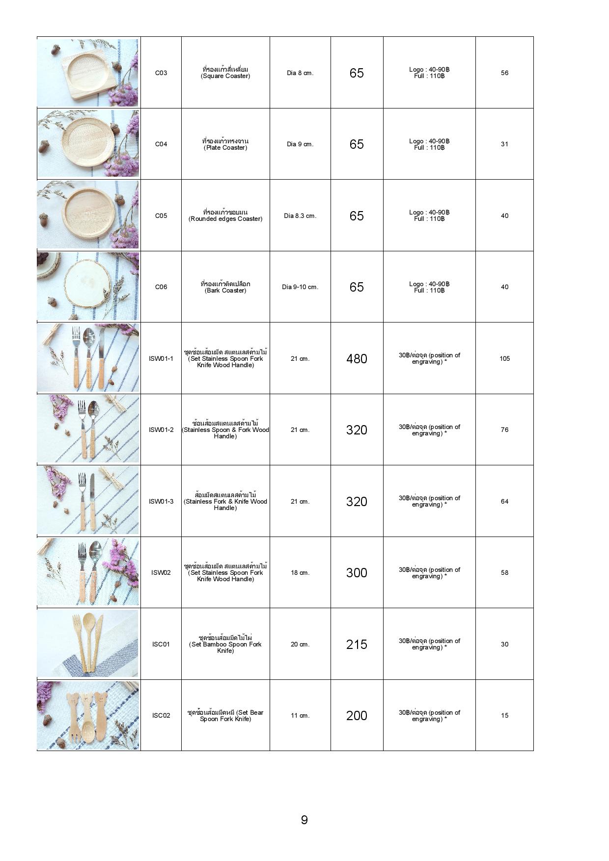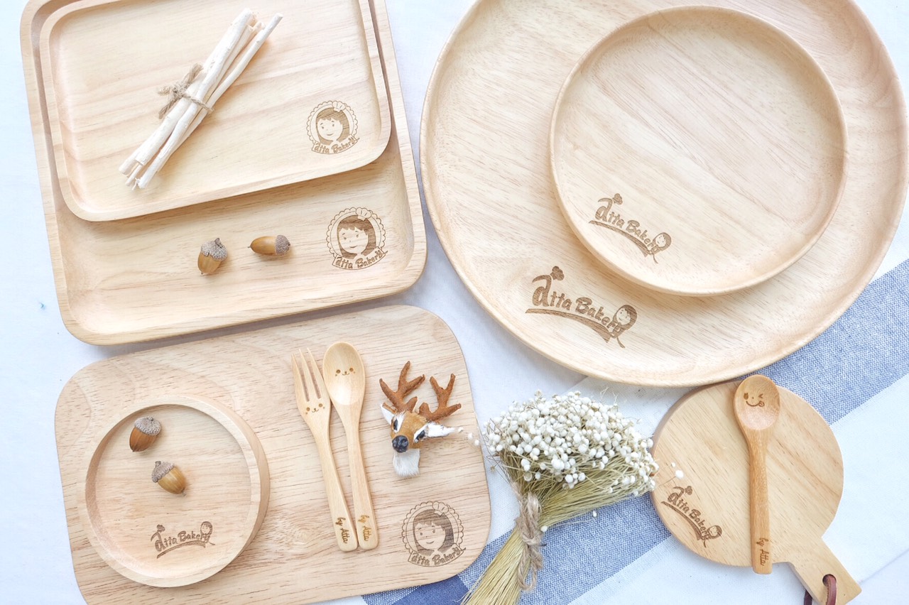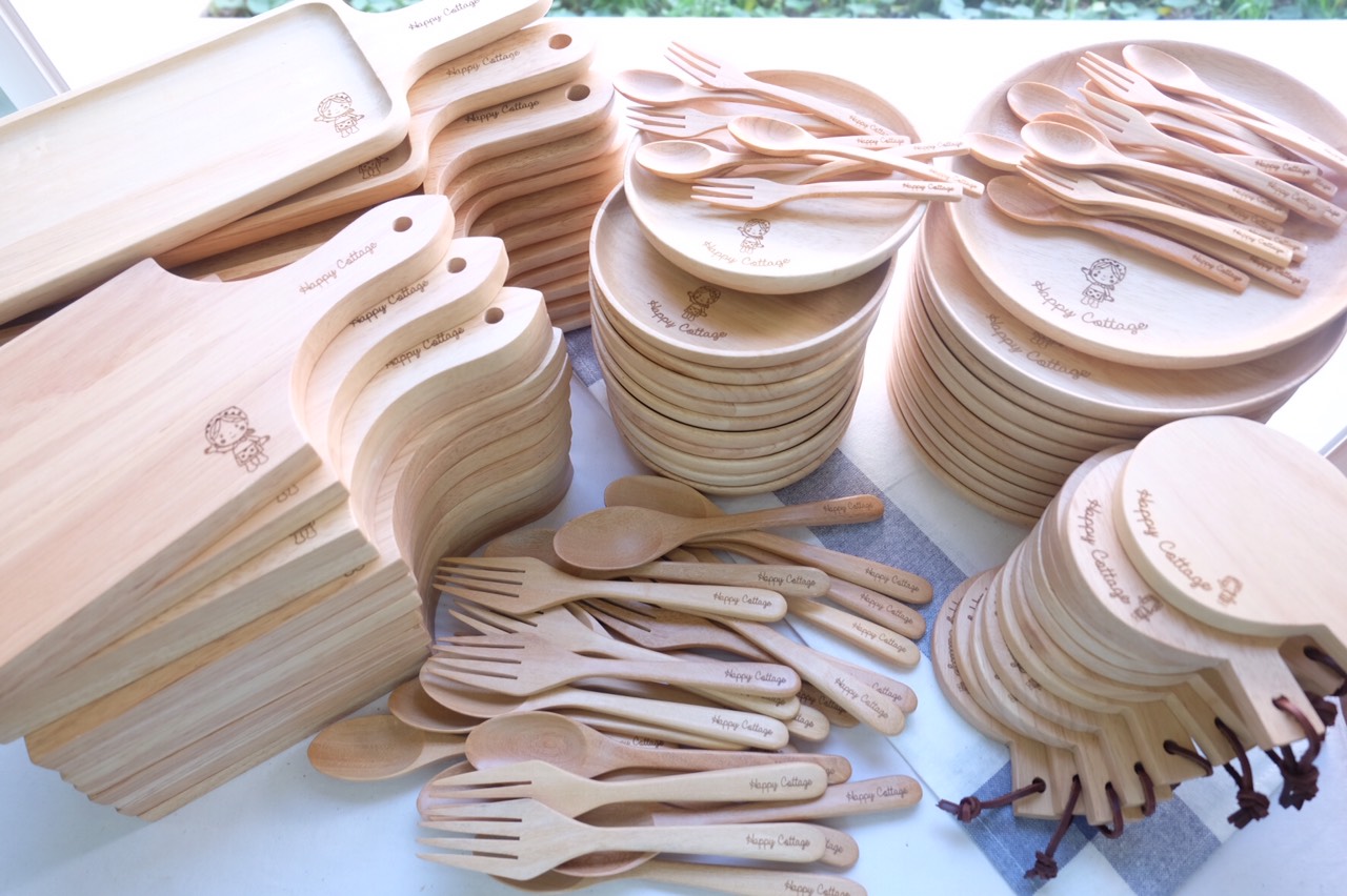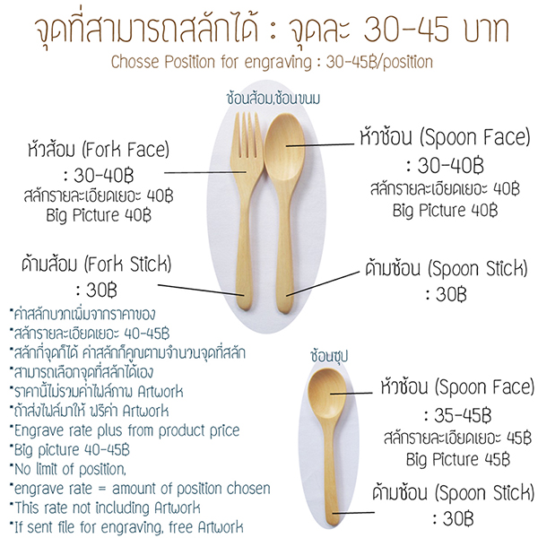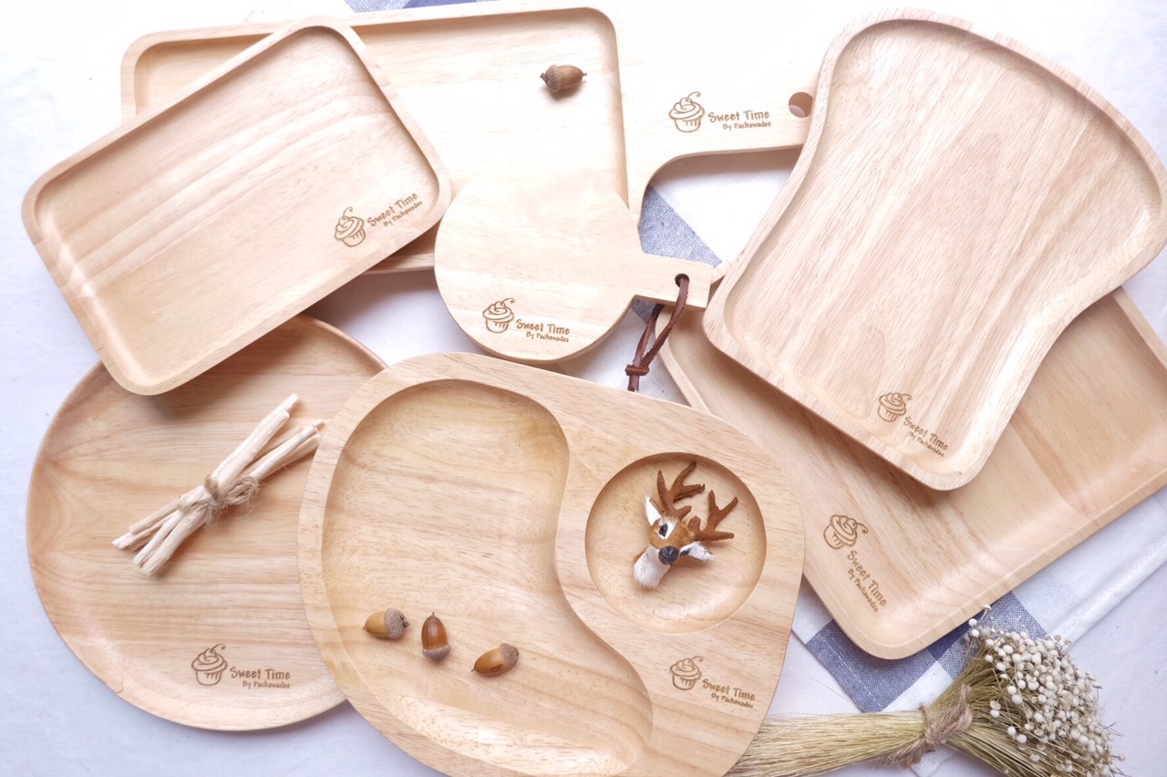 ประเภทจานไม้ ชามไม้ ช้อนไม้ ส้อมไม้ เขียงไม้ สามารถสั่งสลักชื่อ ข้อความหรือโลโก้ได้ (การสลักไม่มีขั้นต่ำ ชิ้นเดียวก็สลัก)