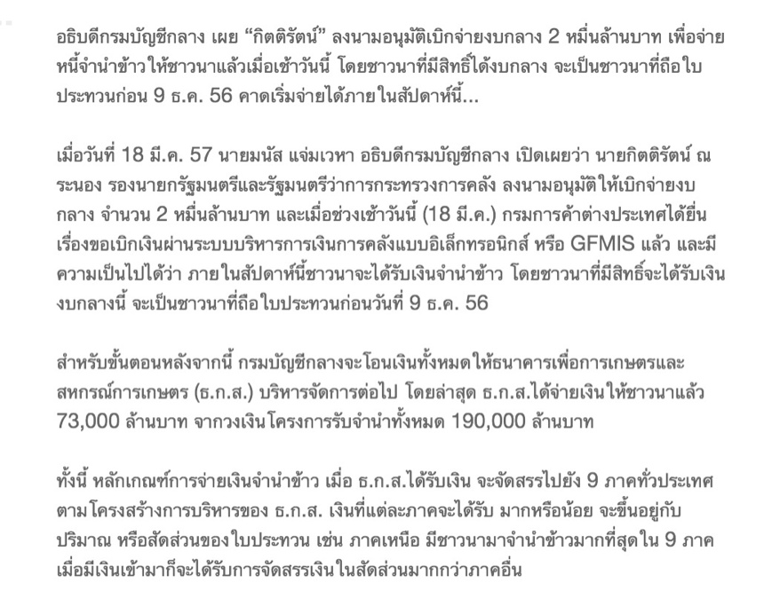 ในวันนั้นจ่ายค่าข้าวให้ชาวนาไปแล้ว 73,000 ล้านบาท ผ่านไปอีกสองสัปดาห์ จ่ายเงินให้ชาวนาไปแล้ว 90,000 ล้านเศษ หรือจ่ายเพิ่มไป
