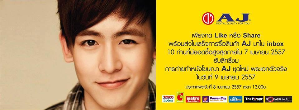 เพียงกด like เพจนี้ Nichkhunthailandby AJ (ตอนนี้เปลี่ยนเป็น Nichkhun AJ แล้วนะคะ) +แชร์ หรือซื้อสินค้าประเภทใดก็ได้ ของ AJ นำใบเสร็จ มายืนยันที่หน้าเพจ หรืออินบ็อกเข้ามา คุณก็มีสิทธิ์ลุ้น เข้าชมการถ่ายทำโฆษณาตัวใหม่ของ AJ และได้ใกล้ชิด กับนิชคุณ อย่าช้านะคะเพียง 10 ท่านแรกเท่านั้น