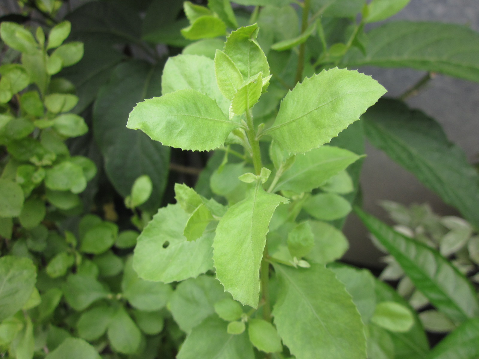 ปลูกมาก็นาน ทานแล้วก็เยอะแต่ไม่รู้จักชื่อ ถามคนให้มาก็ไม่รู้ รู้แต่กินได้ มีรสมัน ไม่มีกลิ่น เป็นไม้พุ่มขนาดกลาง แตกกอดี ปลูกง่าย บังเอิญไปทานข้าวร้านหนึ่งเห็นวางมาเป็นผักทานกับลาบปลาทานแล้วรู้สึกอร่อยดีเลยขอมาปลูกที่บ้าน 3 ปีกว่ายังไม่รู้ชื่อเลยค่ะ