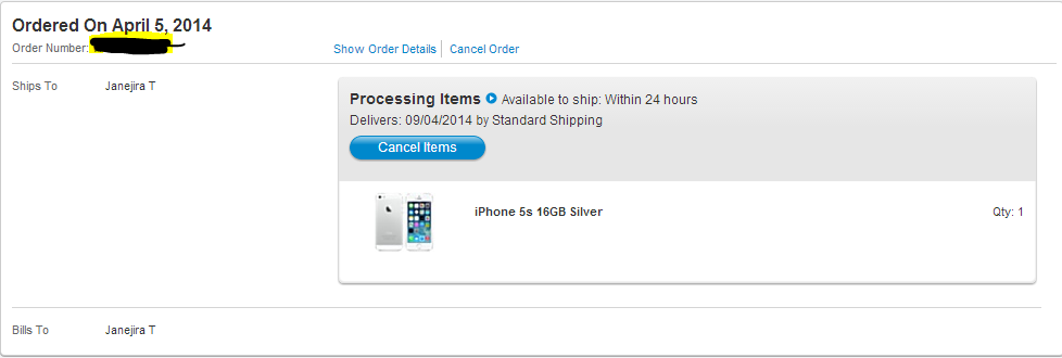 พอดีเราสั่ง Iphone 5s กับทาง Apple store ไปเมื่อวันเสาร์ เย็นๆ (14/09/2014) จนป่านนี้แล้ว มันยังขึ้น Processing Items อยู่เลย นี้เป็นครั่งแรกที่สั่งด้วย ไม่รู้ว่าระยะเวลา Processing Items นานไหมค่ะ
