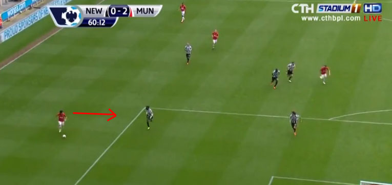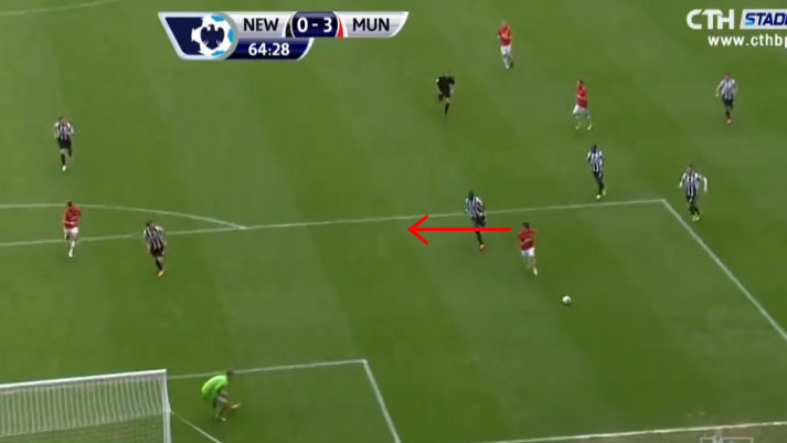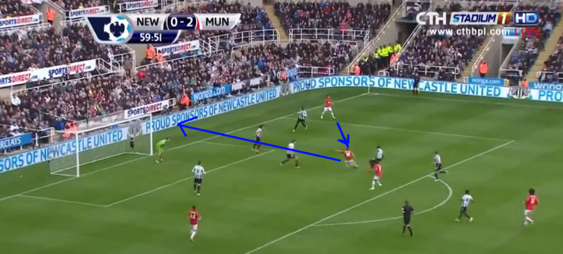 เส้นสีแดง คือ สายตาเวลามอง / เส้นน้ำเงิน คือ เส้นทางการเปิดบอล