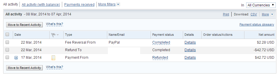 ส่วน Fee Reversal ข้างบนดูเหมือนน่าจะเป็นค่าธรรมเนียมในการส่งเงินครับ ซึ่งในบางกรณีที่ตกลงกันระหว่างผู้ซื้อและผู้ขาย ผู้ขายจะผลักภาระค่าธรรมเนียมมาให้คนซื้อ ซึ่งรายการข้างบนที่เห็นเป็นการดึงเงินคืนมาจาก Paypal สำหรับรายการจ่ายนี้ครับ