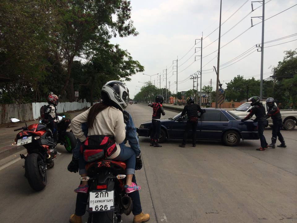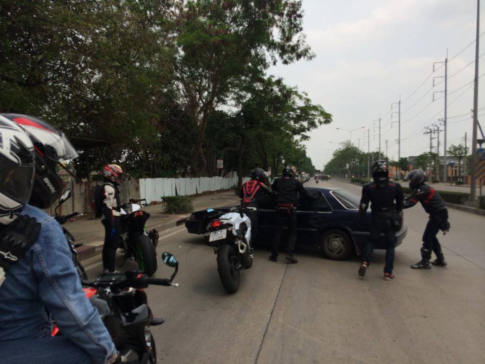 สาเหตุเกิดจาก รถยนต์ดับตรงทางแยกกลุ่มสองล้อเข้าไปช่วยขยับรถยนต์