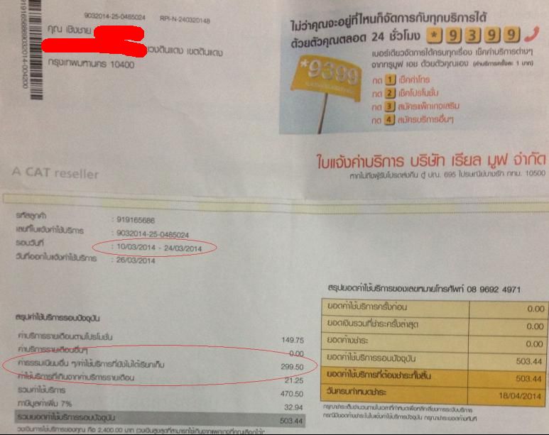 6. รวมค่าใช้บริการที่ต้องชำระทั้งหมด คือ 503.44 บาท กำหนดชำระ 08/04/2014