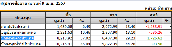 สรุปการซื้อขาย ณ วันที่ 9 เม.ย. 2557
