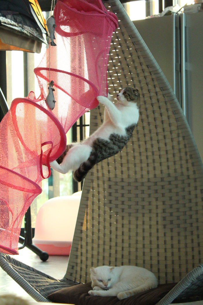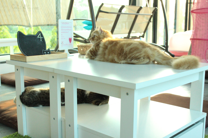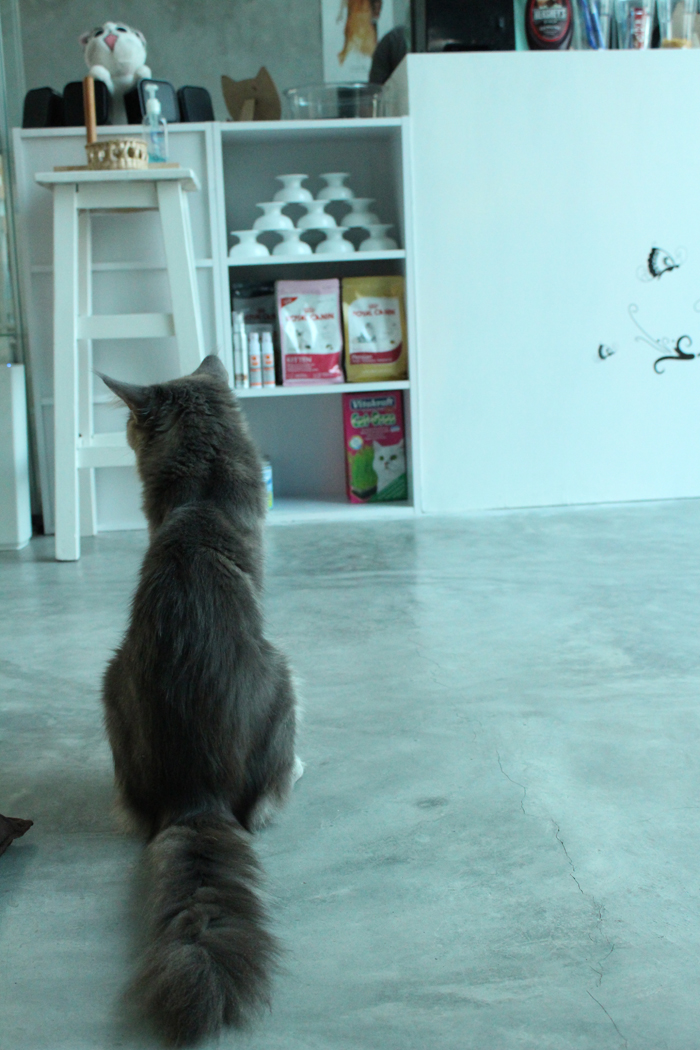 เริ่มจากเมื่อไปถึงเปิดประตูเข้าร้านไปไม่มีลูกค้าเลยมีแค่กลุ่มเราที่ไปกัน 4 คน ก่อนอื่นต้องถอดรองเท้าเปลี่ยนเป็นสลิปเปอร์ของทางร้าน ซึ่งก็ไม่ได้สะอาดอะไรมาก พอเข้าไปในร้านก็ต้องล้างมือด้วยเจลแอลกอฮอล์ก่อนเลย จากนั้นก็รอสั่งอาหาร บรรยากาศในร้านน่ารักดีนะคะ มีที่เล่นสำหรับแมว ของเล่นเยอะแยะ แต่เบาะนั่งก็เป็นเบาะนั่งกับพื้นซึ่งขนแมวติดอยู่เยอะมาก จากนั้นในขณะที่พวกเรากำลังดูเมนู แม่ค้าก็พูดขึ้นมาว่า