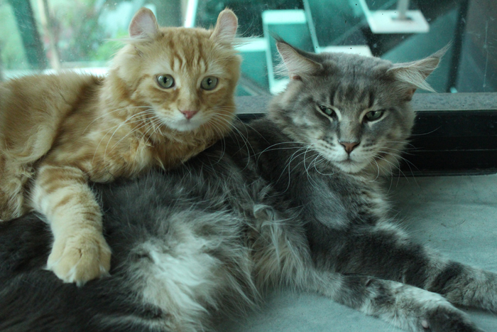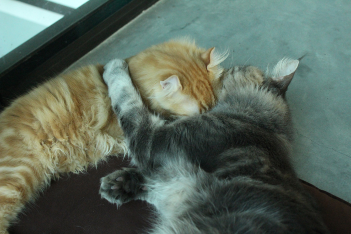 น้องแมวสองตัวนี้น่ารักมาก ตัวสีส้มจะชอบไปคลอเคลียกับตัวสีเทาตลอด