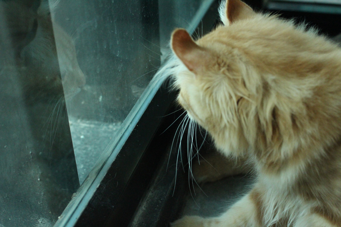 สักพักน้องแมวตัวส้มเดินมาเล่นด้วย มันคงอยากเล่นตามประสาแมว เดินมาดมๆ และมันก็ดมสลิปเปอร์ที่เพื่อนเราใส่ ของร้านเขานั่นแหละค่ะ