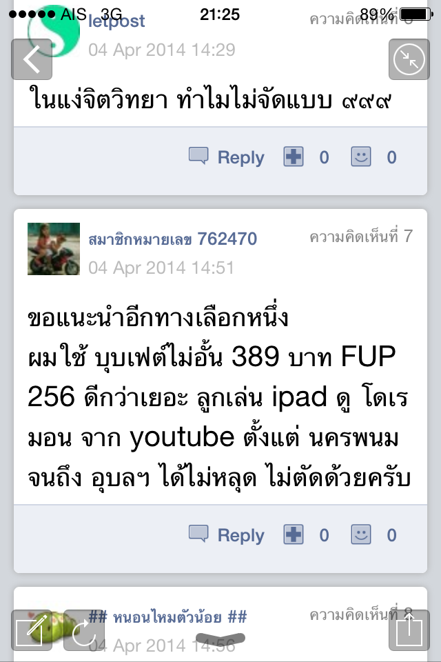 ขอบ่นหน่อยเถอะ ทุกวันนี้ติด Fub อยู่ที่ 64K น่าเบื่อมาก เล่นเฟซบุ๊คจะดูคอมเม้นยังต้องรอโหลด ภาพไม่ต้องพูดถึง หันซ้ายหันขวาไปดูสีอื่นๆ จ่ายเท่ากันเค้าก็ให้ความเร็วตอนติด Fub ตั้ง 128 โปร AIS จ่ายแพงส
