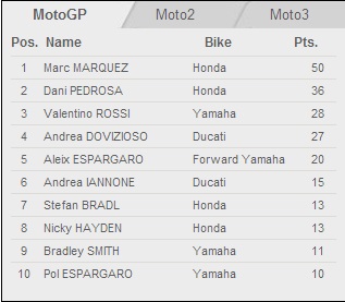 ตามมาด้วยPedrosa และDoviจากDucati ส่วนRossiเข้าอันดับ8และLorenzoอันดับ10ครับ