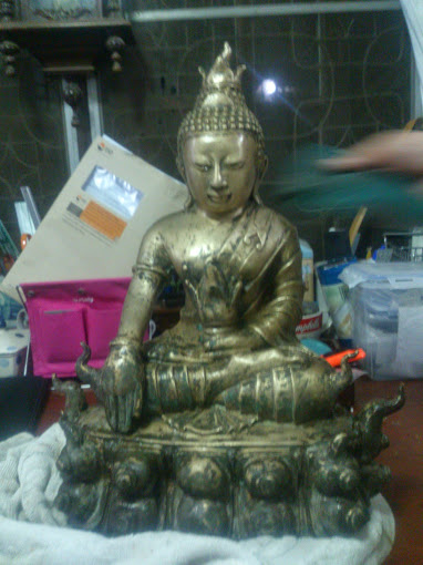 งงเลย ในฐานเหมือนทองเหลือง แต่ภายนอกเหมือนทองแดง เรื่องของเรื่องคือ ผมเกิดมาก็เห็นท่านแล้ว อายุยาวนานมาก แต่ก่อนหน้านี้ไม่กี่ชั่วโมง ท่านคล้ำเหลือเกิน ผมเลยใช้เป็ดราด แปรงสีฟันขัดเพื่อทำความส