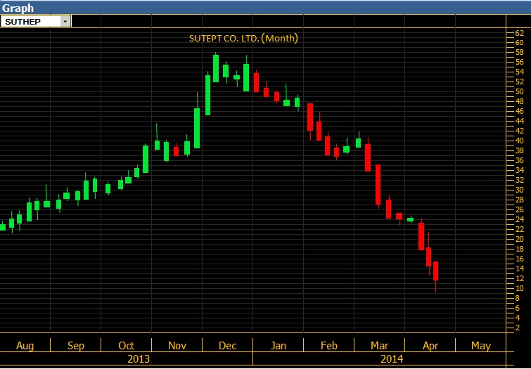 ติดดอย Suthep ที่ 30 บาท เข้าเมื่อเดือนมีนาคม หุ้นตัวนี้เคยทำนิวไฮด์ขึ้นไปถึง 57 บาท เมื่อปลายปีที่แล้ว เข้าไปเก็บที่ 30 บาท ตอนนี้สิบบาทกว่าๆ ติดดอยสูงเลยครับ แต่มาร์เชียร์ให้ถือยาว บอกปลายเดือนนี้หลัง 17 เมษายน ได้งานใหญ่มีปัจจัยบวกหุ้นจะเด้งขึ้นมาทำนิวไฮด์อีกรอบ เลยอยากได้คำแนะนำว่าควรถือต่อดีมั้ยครับ ช่วยดูกราฟให้หน่อยครับ