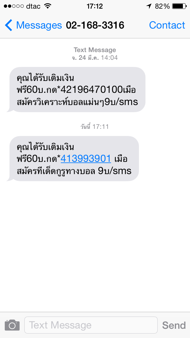 ผมใช้รายเดือนดีแทค ได้ข้อความโฆษณาแบบนี้ตลอด บางทีโทรมา 8 โมง 9 โมง บ่าย 3 ผมเรียนอยู่บ้าง ยังไม่ตื่นบ้าง รำคาญครับ ผมรับทุกครั้งเพราะเข้าใจว่ามีอะไรสำคัญจึงโทรเข้ามา ... แค่นี่ล่ะครับ อยากระบาย