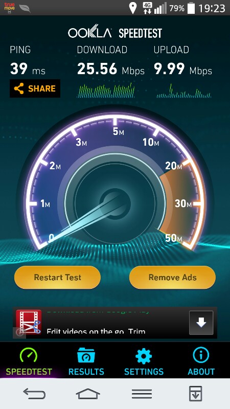หลังจากที่ Truemove H ขยายพื้นที่ให้บริการ 4G มาถึงที่บ้าน หมู่บ้านการเคหะนนทบุรี บริเวณห้าแยกปากเกร็ดแล้ว วันนี้เลยได้ทดลองใช้งานและทดสอบความเร็วค่อนข้างจะพอใจมากๆครับ สัญญาณ 4G มีปานกลางส่วน 3G สัญญาณเต็ม