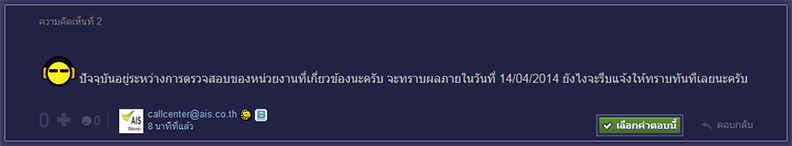 CC AIS แจ้งว่า จะทราบผลการตรวจสอบภายในวันที่ 14/04/57