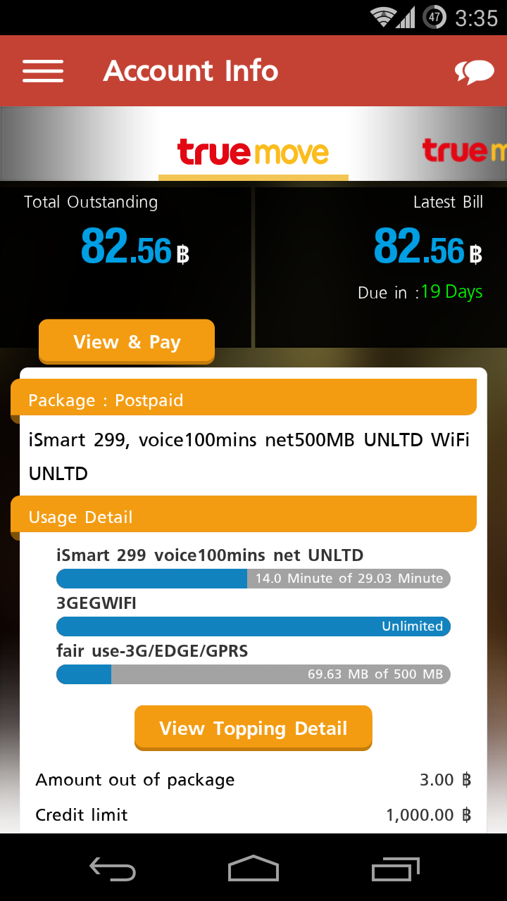 พอวันที่ 16 พอช่างมาติดตั้งเน็ตเรียบร้อยแล้วผมก็เอาซิมทรูอันนั้นมาเปิดใช้ครั้งแรก จำได้ว่าพอโทรออกครั้งแรกมันยังส่งข้อความมาบอกประมาณว่าตอนรับเข้าสู่เครือข่ายทรูมูพเฮช หลังจากนั้นผมก็ไปลงโปรแกรม true iservice เพื่อเอามาเช็คค่าโทร ปริมาณการใช้เน็ต ก็ปรากฏว่ามียอดค้างชำระโผล่มาจากไหนไม่รู้ 82.56 บาท แถมค่าโทรที่ควรจะฟรี 100 นาที ก็เหลือแค่ 29.03 นาที