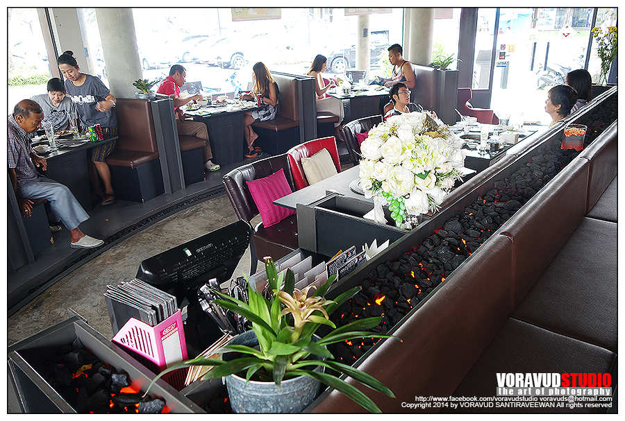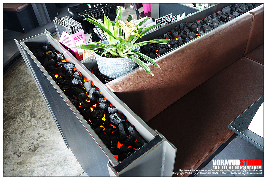 ส่วน partition ที่กั้นไว้ ตกแต่งได้เก๋มากครับ ทำเป็นไฟแดงๆข้างใต้ แล้วมีถ่านอยู่ด้านบน เหมือนเตาปิ้งย่าง เก๋ดีทีเดียว