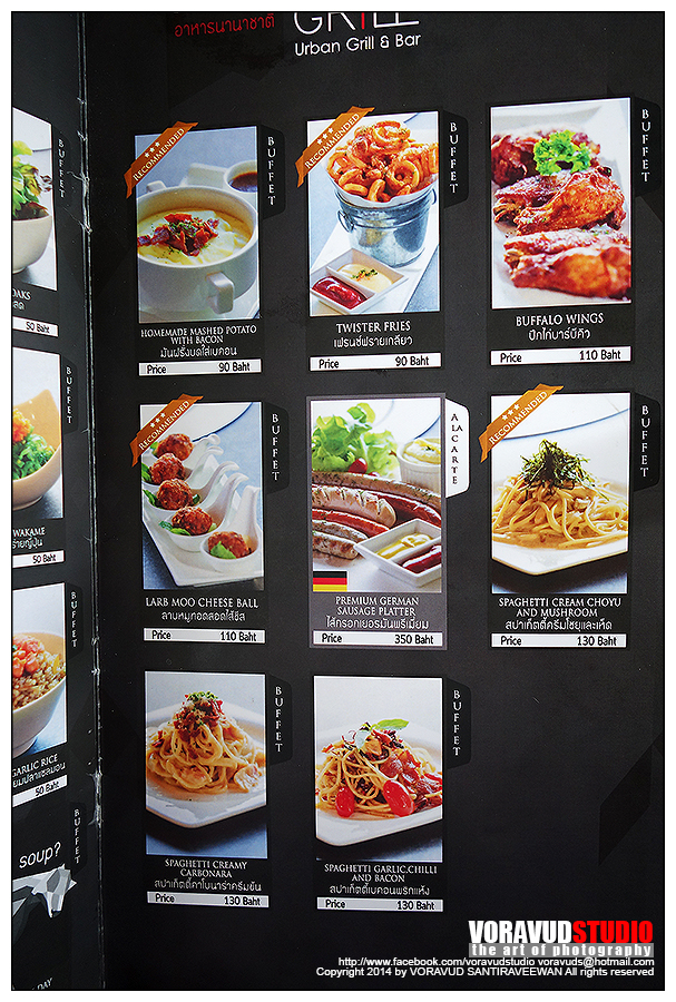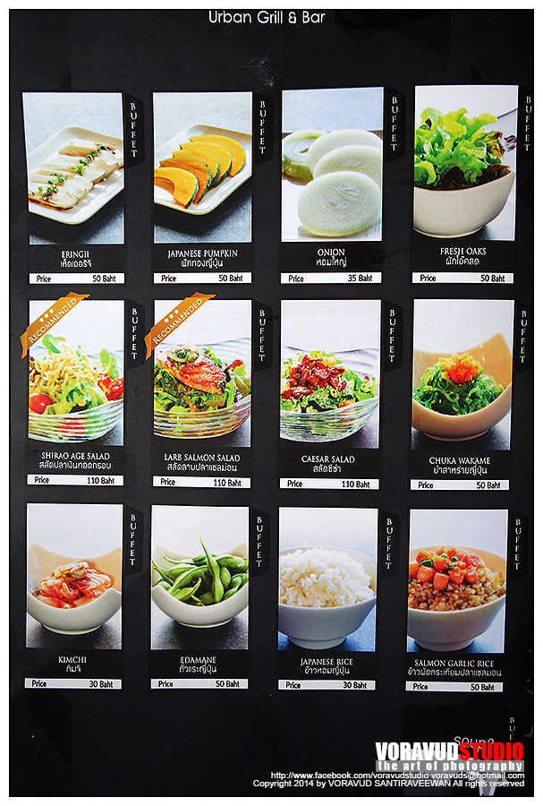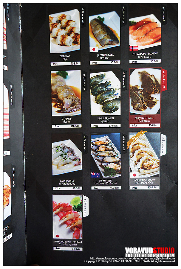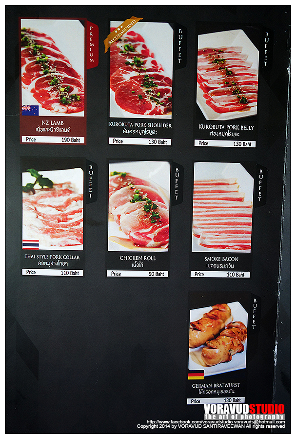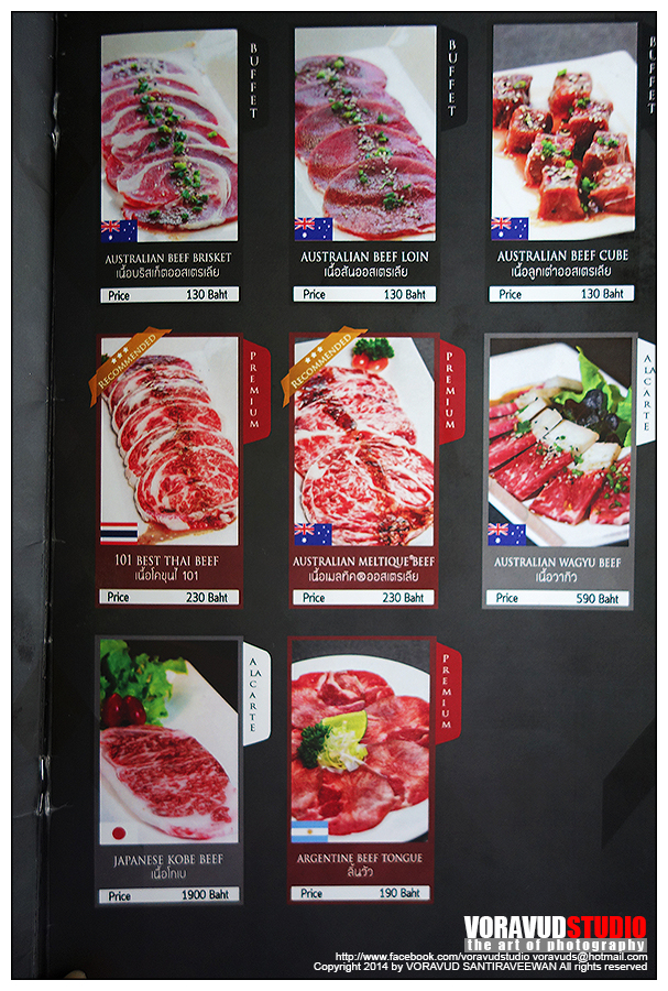 มาดูเมนูกันก่อนเลยดีกว่า อาหารมีหลากหลายใช้ได้เลย จนลังเลว่า จะกินเนื้อย่าง หรืออาหารข้างเคียงดี บุฟเฟ่ห์ที่นี่มี 2 แบบครับ แบบ Buffet ปกติ ราคา 489+ กับ Premium 689+ (ราคาผมจำไม่ได้เป๊ะๆนะครับ) ส่วนเมนู จะมีอักษรกำกับอยู่ แบบปกติ สั่งได้เฉพาะตัวอักษร Buffet แบบ Premium สั่งเมนู Premium เพิ่มได้ ส่วนแบบ Alacart ต้องสั่งเพิ่มครับ