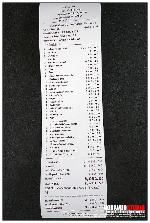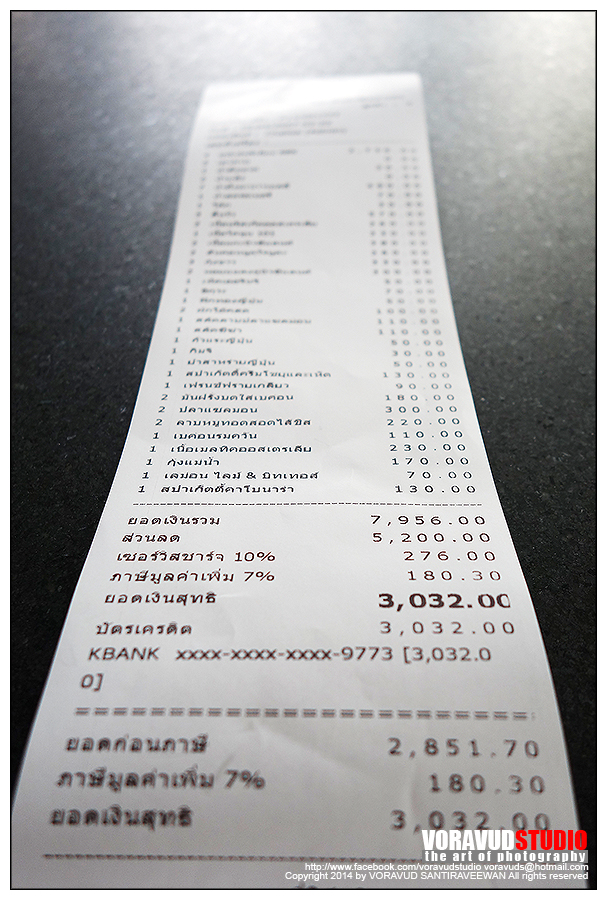 บิลที่นี่แปลกดี คิดราคาอาหารทั้งหมดที่เราสั่งให้ด้วย ให้ดูเลยว่าทานคุ้มหรือเปล่า ผมสั่งไปทั้งหมดมูลค่า 8,000 บาท แต่จ่ายค่า Buffet ไปแค่ 3,000 บาทเองครับ