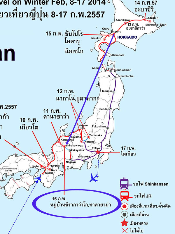 - นาโกย่า : ถึงนาโกย่า 12.19 น. เปลี่ยนไปนั่งรถไฟ JR HiDa รอบ 12.58 น. เดินทางไปทาคาย่า