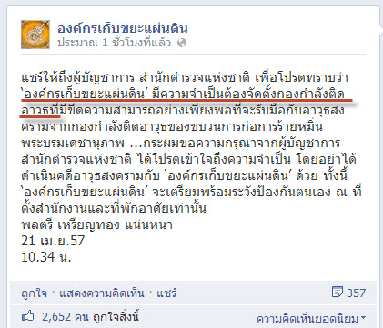 วันก่อน ปปช.ขอมีกองกำลังติดอาวุธ นัยว่าเอาไว้ป้องกันตนเอง ต่อมาไม่นาน ตลก.ก็ขอมีกองกำลังติดอาวุธเช่นกัน ด้วยข้ออ้างอย่างเดียวกัน ผ่านมาไม่เท่าไหร่ ไอ้องค์กร (เก็บ)ขยะแผ่นดิน ก็ขอมีกองกำลังกับเขามั่ง