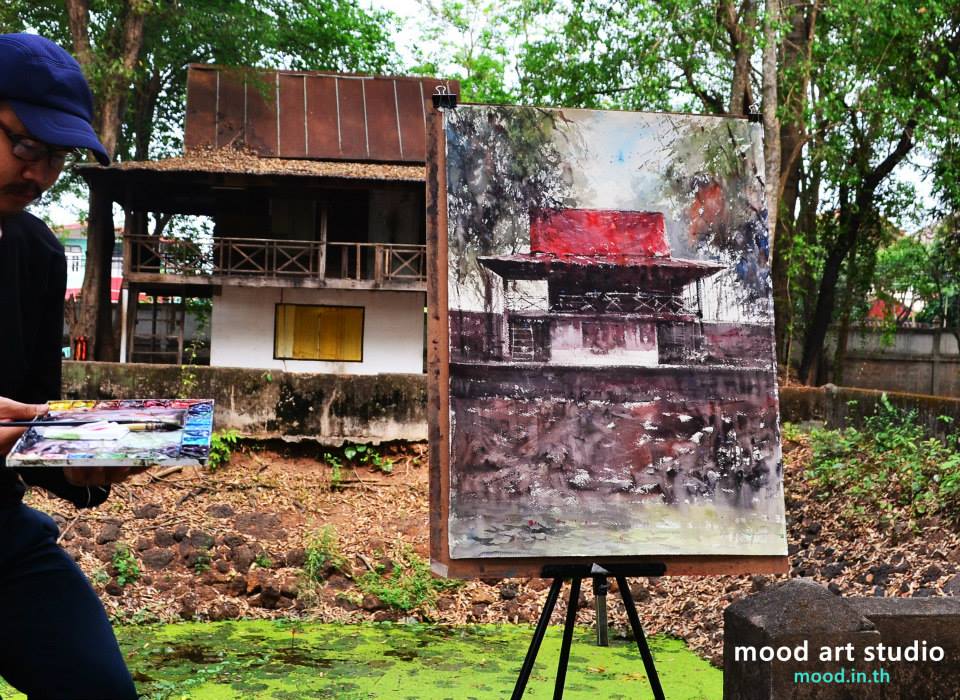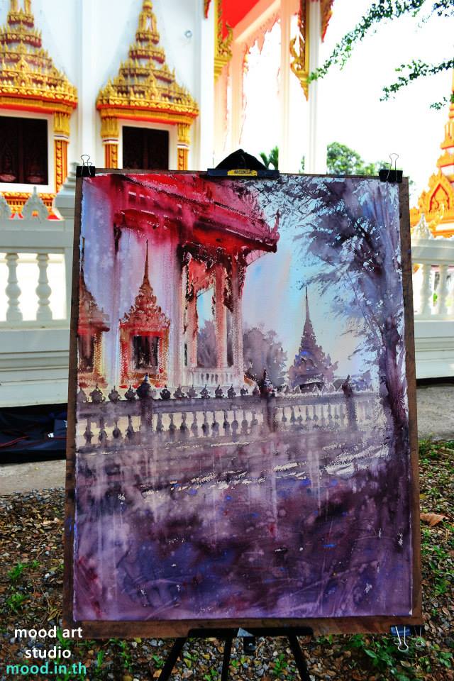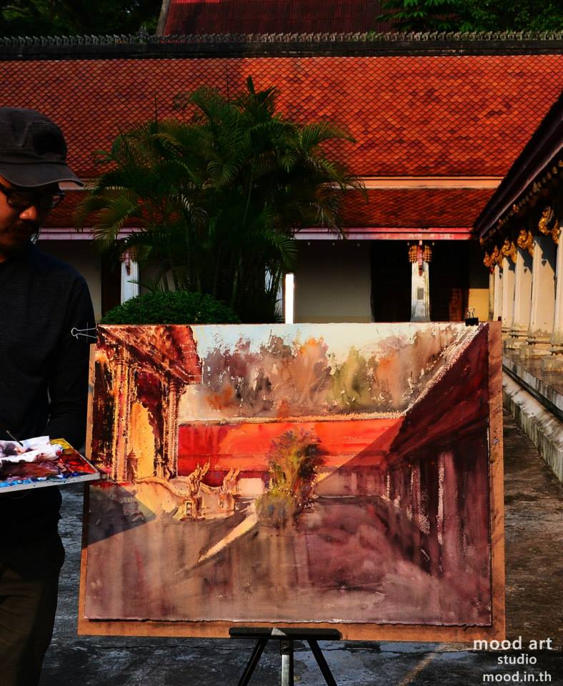 เดินกลางกลับบ้านเกิด ไปเขียนสีน้ำตามสถานที่ต่างๆ ส่วนใหญ่จะเป็นวัดวาอาราม